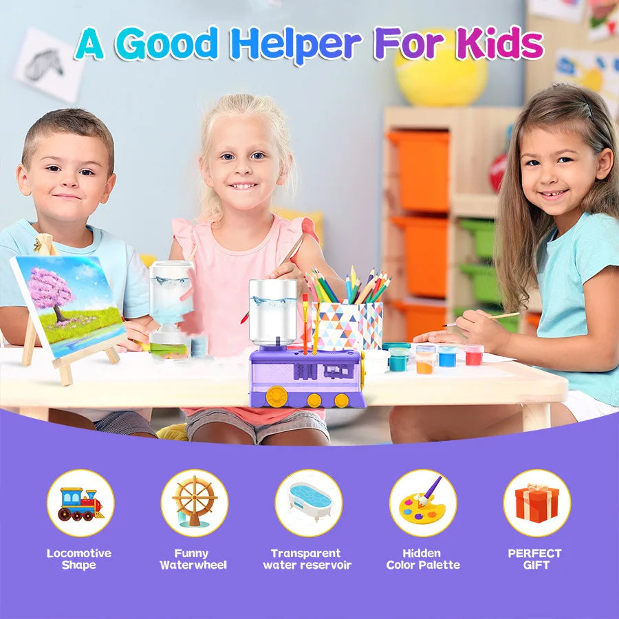 This product is a paint brush cleaner designed for all artists , featuring a fun locomotive shape and playful design. It includes a fun waterwheel, transparent water reservoir, and hidden color palette, making brush cleaning simple and engaging. Safe, easy to use, and mess-free, it’s the best choice for young artists who love painting and parents who want a neat creative space.